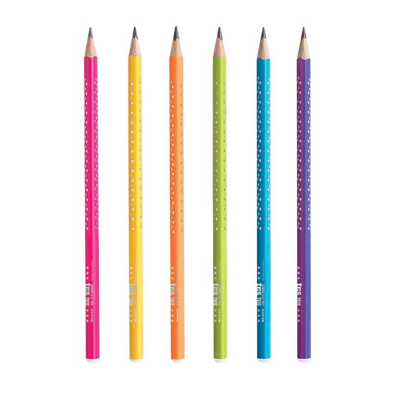 Lápis preto de madeira reflorestada, com corpo triangular em cores neon super modernas e estampa metalizada de estrelinhas! Traço HB.