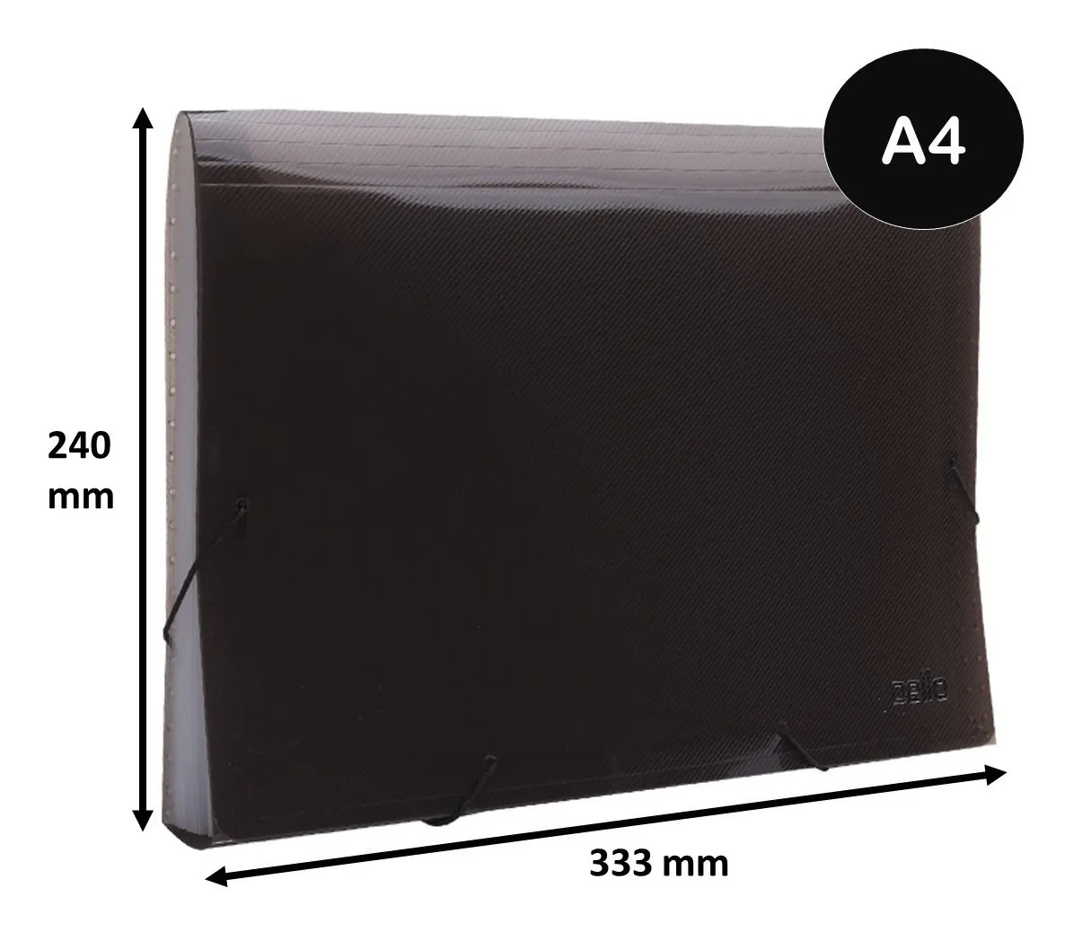 Pasta Sanfonada de tamanho A4 com 12 divisórias, usada para organizar documentos em categorias (meses, assuntos) com etiquetas, feita de material resistente.