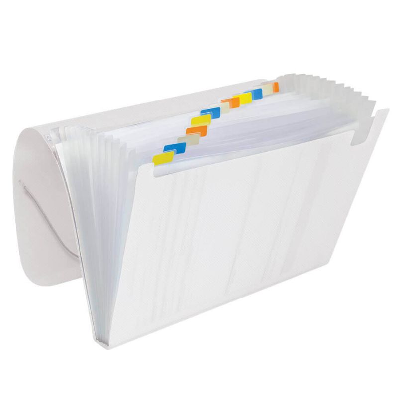Pasta Sanfonada de tamanho A4 com 12 divisórias, usada para organizar documentos em categorias (meses, assuntos) com etiquetas, feita de material resistente.