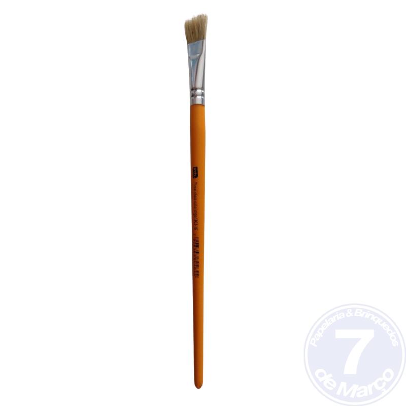 É um instrumento de pintura com ponta reta e larga, ideal para preencher grandes áreas, fazer fundos e criar traços uniformes em trabalhos escolares ou artísticos.