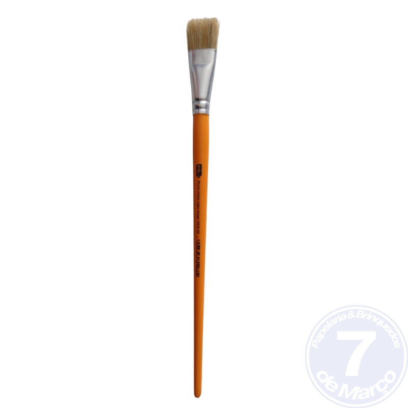É um instrumento de pintura com ponta reta e larga, ideal para preencher grandes áreas, fazer fundos e criar traços uniformes em trabalhos escolares ou artísticos.