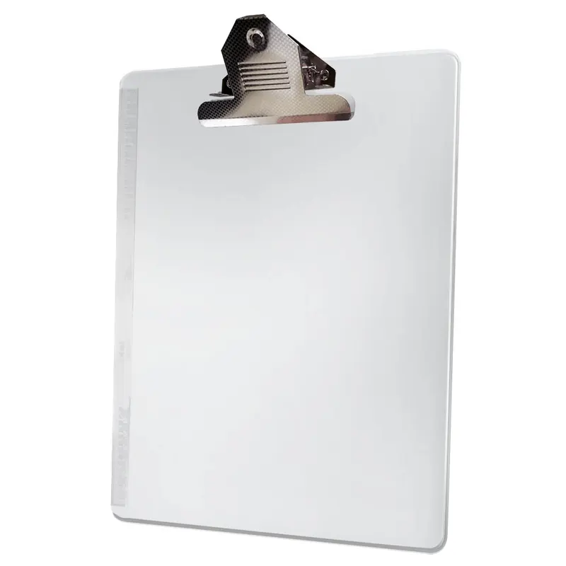 Prancheta de suporte rígido e transparente (cristal) no tamanho ofício, feita de poliestireno, com um prendedor de metal resistente para fixar papéis, réguas embutidas e cantos arredondados. Tamanho 23 x34,5cm
